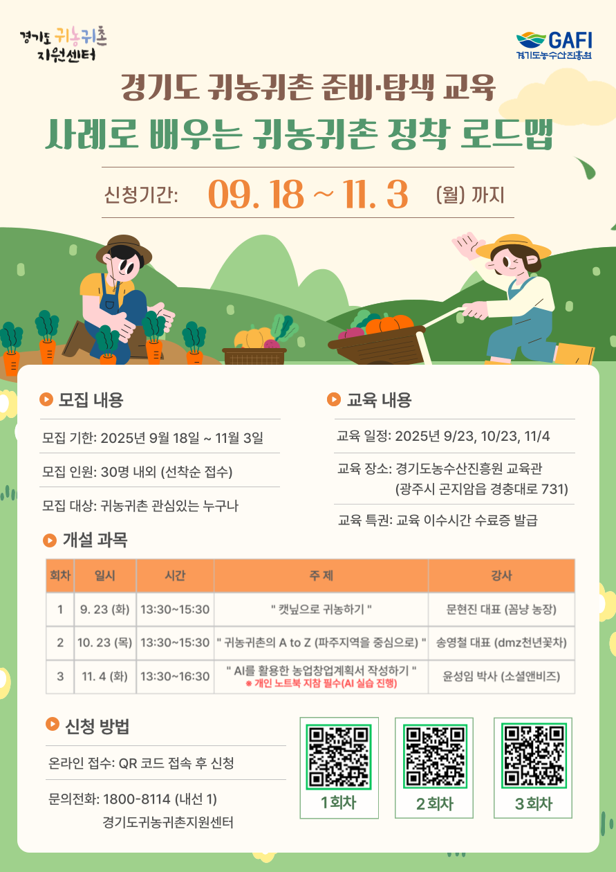 경기도 귀농귀촌지원센터 상상하던 모든 꿈이 현실이 되는 곳! 홈으로 공유하기 인쇄하기 귀농귀촌준비 가이드 농업인력포탈온라인 교육 홈 비밀번호 입력 ※ 글 작성 시 입력했던 비밀번호를 입력해 주세요. 확인 취소 닫기 [모집] 「경기도 귀농귀촌 준비·탐색 교육」 수강생 모집 안내 2025-09-15 □ 과정 소개 사례로 배우는 경기도 귀농귀촌 정착 로드맵 □ 교육 운영 내용 ○ 모집 기간 : 25년 9월 18일(목) ~ 11월 3일(월)까지 ○ 운영 기간 : 9/23, 10/23, 11/4 ○ 교육 인원 및 선정기준 : 30여명 내외, 온라인 선착순 접수 - 경기도로 귀농귀촌을 희망하는 도시민, 귀농귀촌 관심있는 누구나 ○ 교육 방식 : 집합 대면교육 ○ 교육 장소 : 경기도농수산진흥원 교육관 (경기도 광주시 곤지암읍 경충대로 731, 2층 교육관) ○ 세부 내용 : - 강사의 귀농 배경과 경기도 지역 정착 사례 등 실제 경험 공유 - 안정적 정착 포인트와 정책 활용, 질의응답을 통한 궁금증 해소 - AI를 활용한 농업창업계획서 작성법 실습 및 이해 첨부파일 1회차_캣닢으로 귀농하기.png [301.5 KB] 다운로드 2회차_귀농귀촌의 A to Z (파주지역을 중심으로).png [177.3 KB] 다운로드 3회차_AI를 활용한 농업창업계획서 작성하기.png [222.7 KB] 다운로드 이전 다음 목록