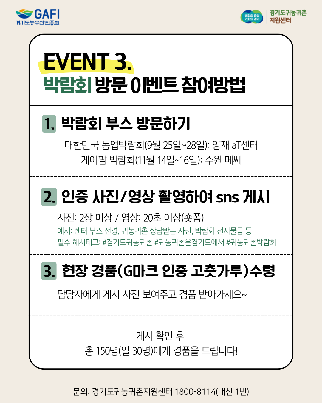 - 9월 대한민국 농업박람회, 11월 케이팜 박람회의 경기도귀농귀촌지원센터 부스 방문하시고, 이벤트 참여하세요~ SNS 게시 이벤트를 통해 총 150분께 5천원 상당의 경품을 드립니다!