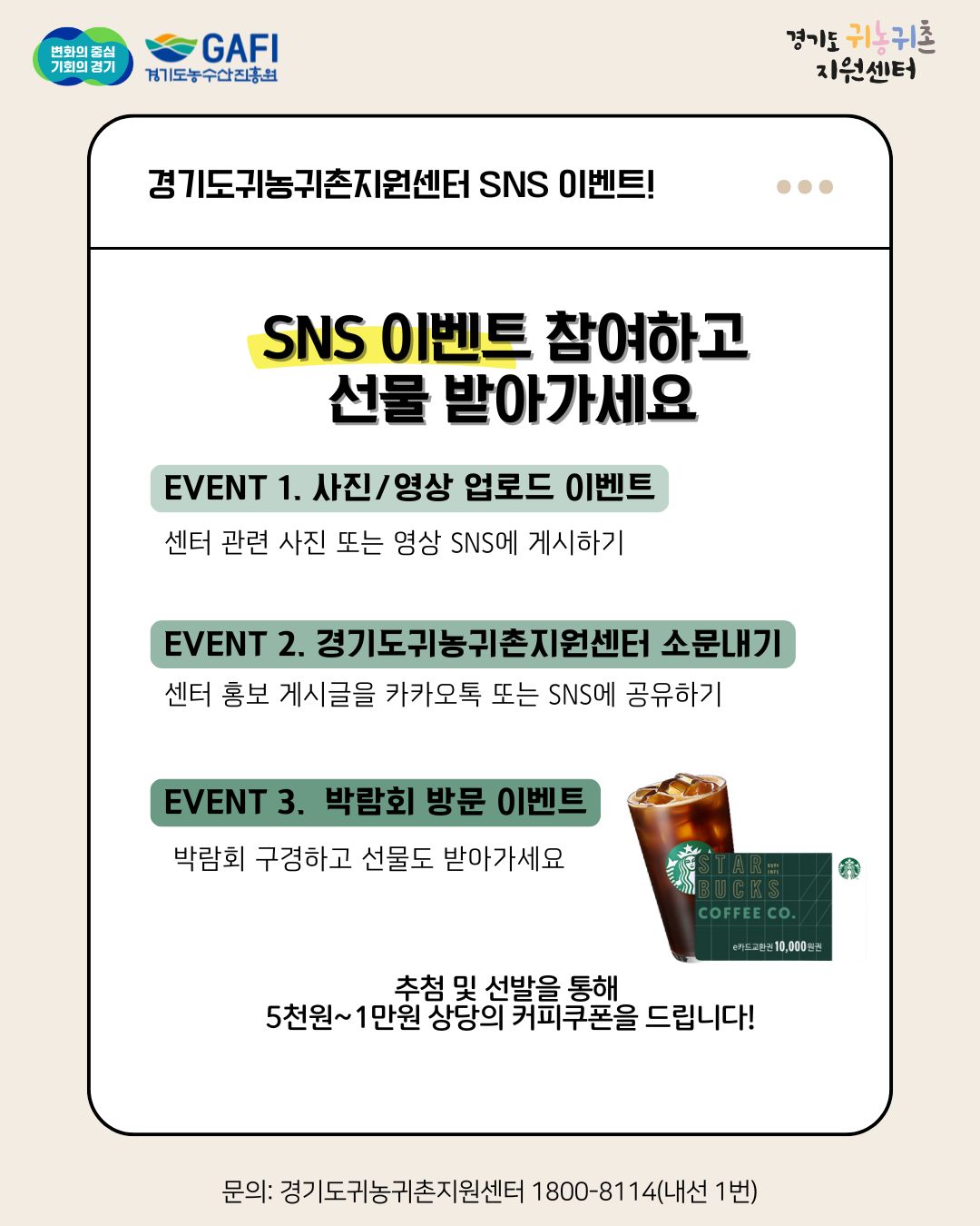- 경기도귀농귀촌지원센터 누리집 내 게시글/SNS 및 블로그의 경기도귀농귀촌 관련 홍보물/경기도귀농귀촌관련 게시글 등을 공유 한 뒤, 인증샷을 업로드 해주시면, 추첨을 통해 총 300분께 커피쿠폰 5천원 기프티콘을 드립니다!