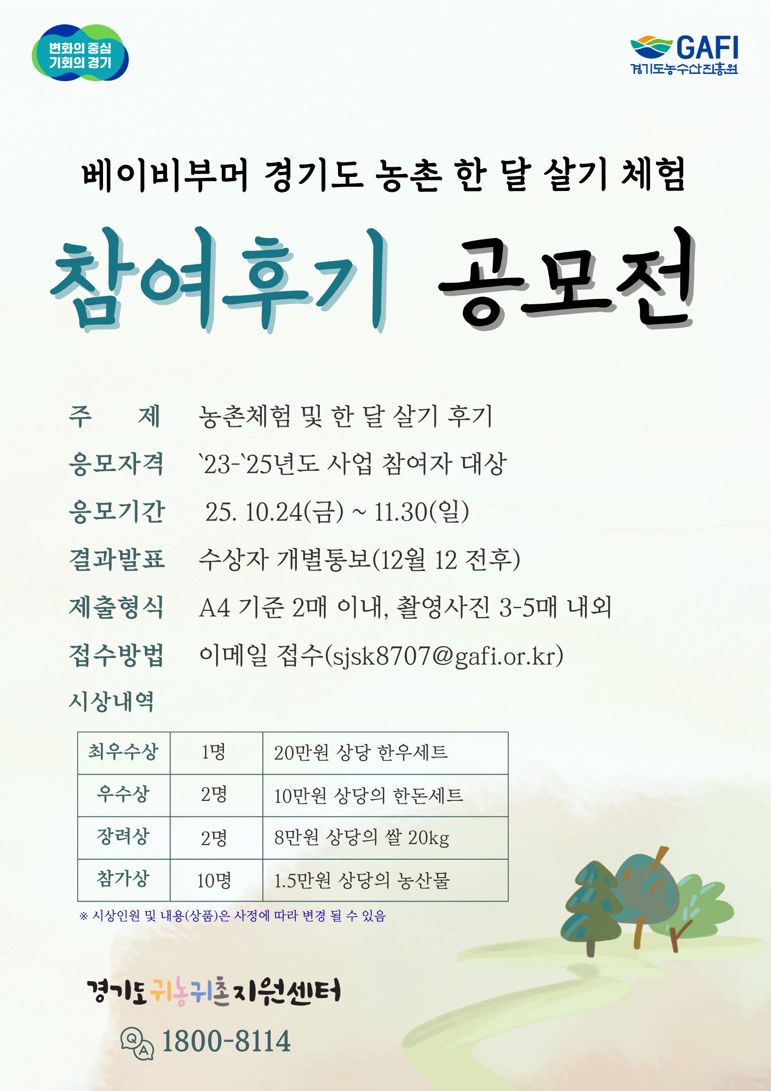경기도 귀농귀촌지원센터 상상하던 모든 꿈이 현실이 되는 곳! 홈으로 공유하기 인쇄하기 귀농귀촌준비 가이드 농업인력포탈온라인 교육 홈 비밀번호 입력 ※ 글 작성 시 입력했던 비밀번호를 입력해 주세요. 확인 취소 닫기 [공모전] 베이비부머 경기도 농촌 한 달 살기 체험 참여 후기 공모전 2025-10-24 경기도귀농귀촌지원센터에서는 귀농귀촌을 희망하는 베이비부머 세대 도시민에게 경기도 농촌에 거주하며 농업 및 농촌생활을 직접 체험하고, 주민과 교류할 수 있는 기회를 제공하였습니다. 이에 「베이비부머 농촌 한 달 체험」 참여자를 대상으로 후기 공모전을 개최하오니 많은 참여 바랍니다. □ 공모개요 ○ 공 모 명 : 2025 베이비부머 농촌 한 달 체험 참여 후기 공모전 ○ 공모기간 : 2025.10.24.(금)~ 11.30(일) 까지 37일간 ○ 공모대상 : 23년도~25년도 베이비부머 농촌 한 달 살기 체험 참여 완료자 ○ 공모내용 : 한 달 살기 경험 전반 (생활·여행·지역문화·인상 깊은 에피소드 등) ○ 공모방식 - 체험 후기를 텍스트 형태로 작성하여(A4 기준 2매 이내) 직접 촬영한 사진 3~5매 첨부 ( 사진은 최소 가로*세로 1080px, 해상도 300dpi 이상) 제출 ★ 자세한 내용은 공고문과 신청서식을 확인하세요 첨부파일 붙임2) 베이비부머 농촌 한 달 살기 후기 공모전 참가신청서.hwp [144.0 KB] 다운로드 붙임1) 베이비부머 농촌 한 달 살기 체험 후기 공모전 공고문.hwp [153.5 KB] 다운로드 이전 목록